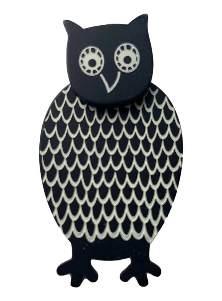 Brosch av akryl / plexiglas, svart uggla. Designer smycken från K Form Tommy Karlsson, tillverkad i Sverige. Ca. 3,5 x 3,5 cm