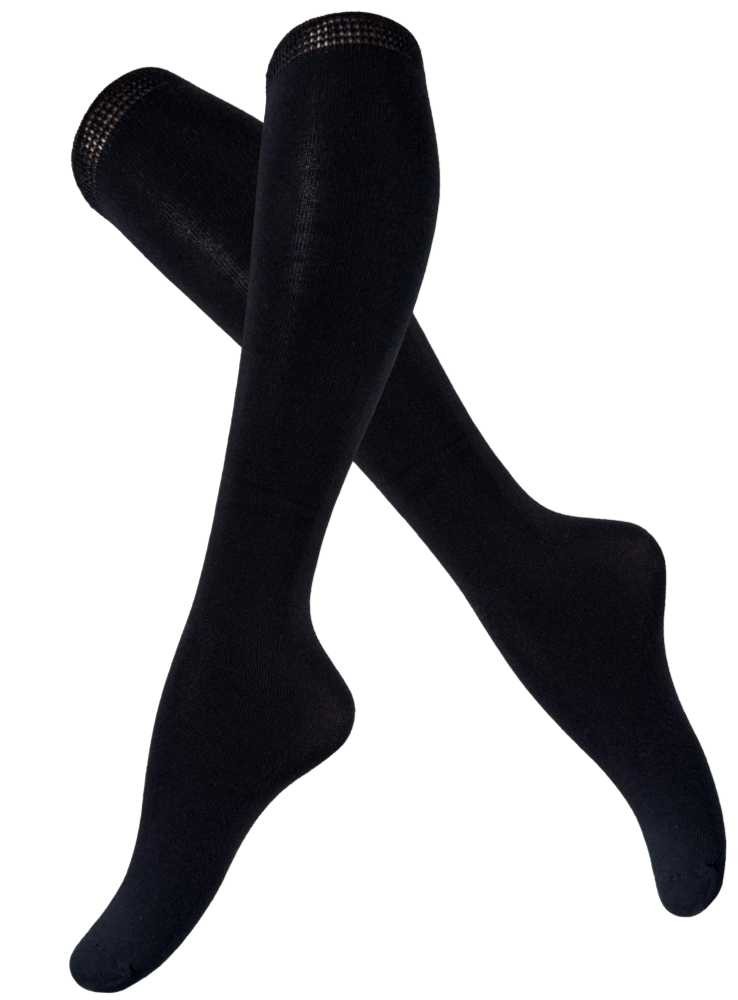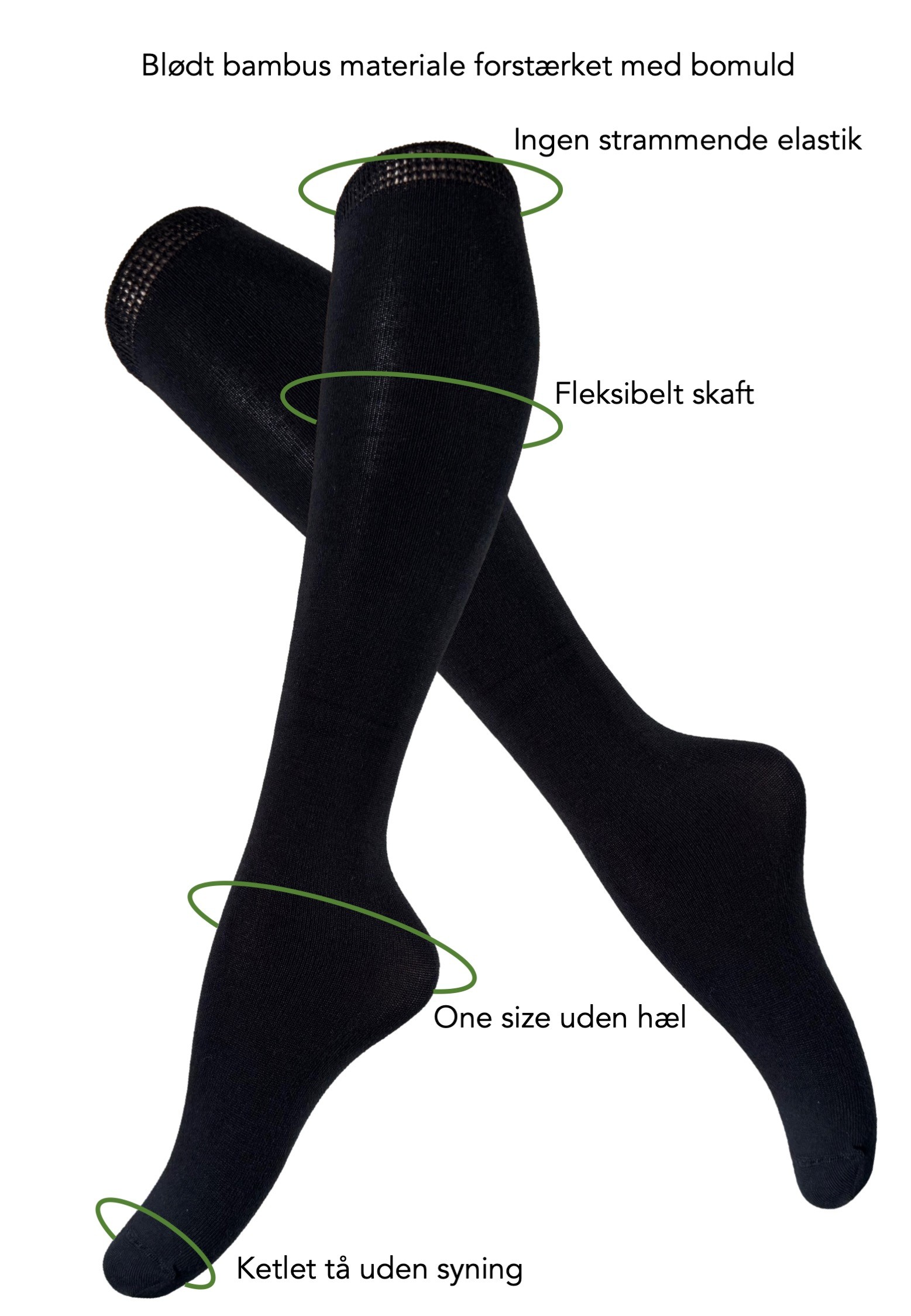 Svarta knästrumpor i bambu från Kilde. De mjuka och flexibla knästrumporna har ingen "sväng" i hälen, så de är oberoende av skostorlek. Längd: XS = 31 cm (0-3 år); S = 38 cm (3-5 år); S+ = 45 cm (5-7 år); M = 55 cm (7-9 år) Strumporna i storlek M är även för vuxna. och mäter i avslappnat tillstånd (när de inte är sträckta) bredd 7 cm (omkrets 14 cm) och längd 55 cm. Foten har en kettlad tå, så det finns ingen sömnad, skaftet är väldigt flexibelt och mjukt - de kan användas av alla, även med diabetes eller ortose. De är utvecklade i Kildes välkända slitstarka Long Life bambu-bomullsgarn, där bambun tvinnas runt en bomullstråd för att stärka garnet. KÖP 3 OCH FÅ 17%
