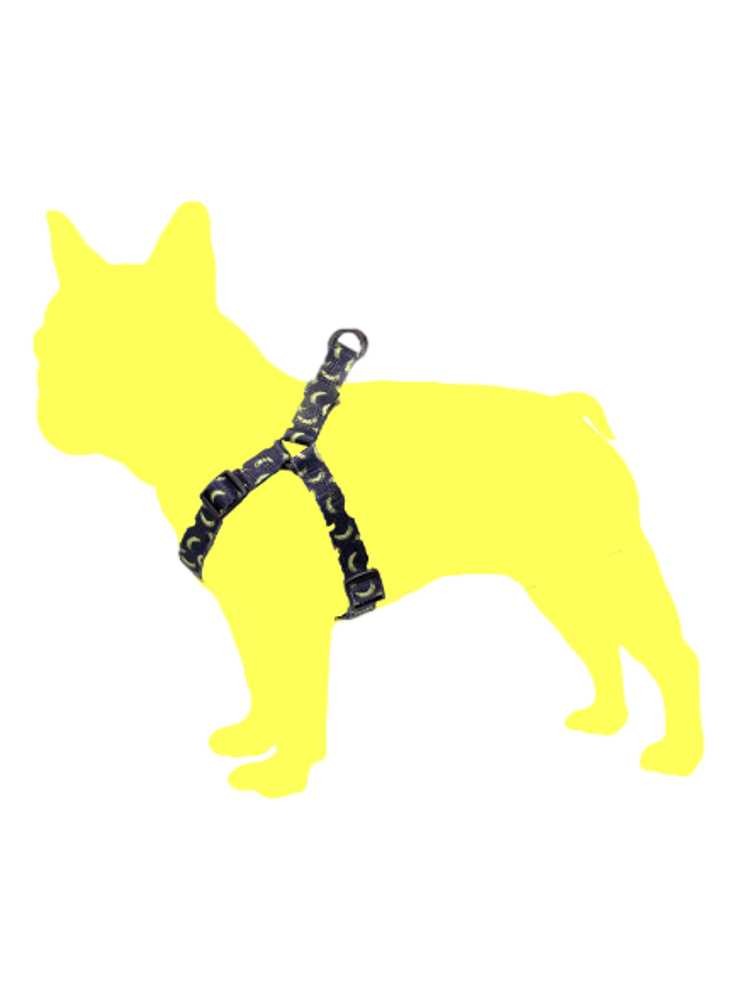 Smart hundsele med tryckt bananmönster. Kan justeras från 35 cm - 60 cm runt bröstet. Nylonband 2 cm brett, plast- och metallspännen för steglös justering.